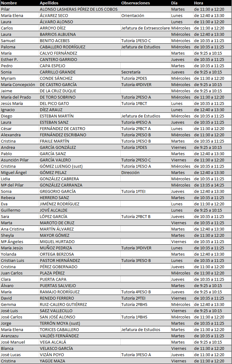Se recuerda que, para ser atendidos, es necesario solicitar cita previa contactando directamente con el profesor o profesora mediante su correo electrónico institucional o a través del teléfono del centro.